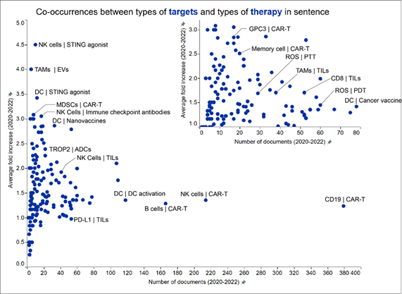 治療標的と治療法の種類の共起は、さまざまな治療戦略がどのように開発され、適用されているかについての重要な関係性や洞察を明らかにします。これには、特定の分子標的、免疫経路、がん治療で研究・使用されている治療法を研究することが含まれます(図4参照)。