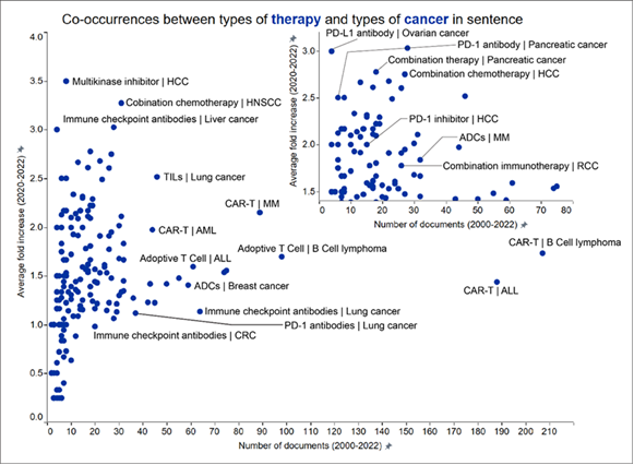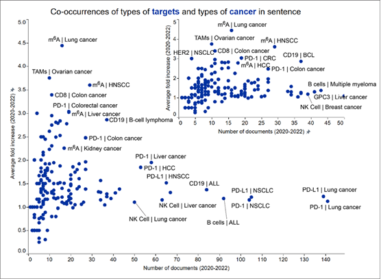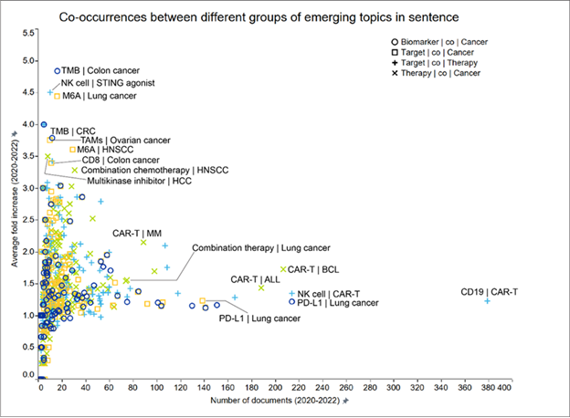 標的とがんの種類の共起は、分子標的と、さまざまながんの特性との相互作用を指します。これらの関係を理解することは、効果的な治療法を開発し、患者の転帰を改善するために非常に重要です。図3に示されているように、近年、いくつかの共起が急増しています。