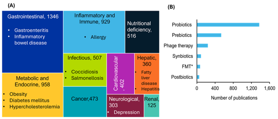 This demonstrates the increased focus on pet health in recent years and that most research in this field has not reached commercialization. However, various therapeutic strategies are gaining traction based on our analysis. As we see in Figure 3A, many diseases are associated with gut microbiome dysbiosis, with gastrointestinal, metabolic, and immune-related conditions being the most documented. Figure 3B highlights therapeutic strategies aimed at restoring microbial balance, with probiotics and prebiotics receiving the highest research attention. This comparison underscores the growing scientific interest in microbiome-targeted interventions for diverse health conditions.
