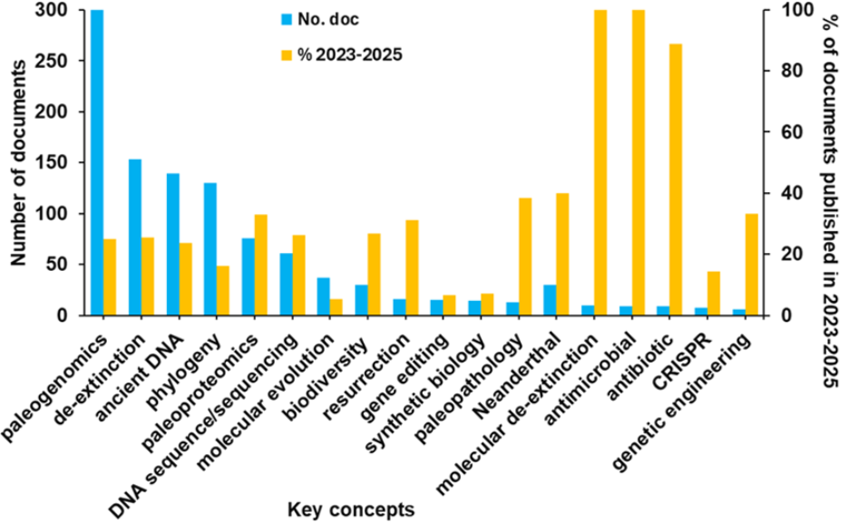 - Antimicrobianos e antibióticos são o tema da maioria dos documentos relacionados à desextinção molecular nos últimos três anos (considerando dados de 2025 apenas até março). Três interseções principais são dignas de nota: (1) descoberta de peptídeos antimicrobianos antigos por meio da paleogenômica, (2) estratégias antimicrobianas baseadas em CRISPR desenvolvidas a partir de ferramentas de desextinção e (3) descoberta de novos antibióticos a partir de comunidades microbianas ressuscitadas.