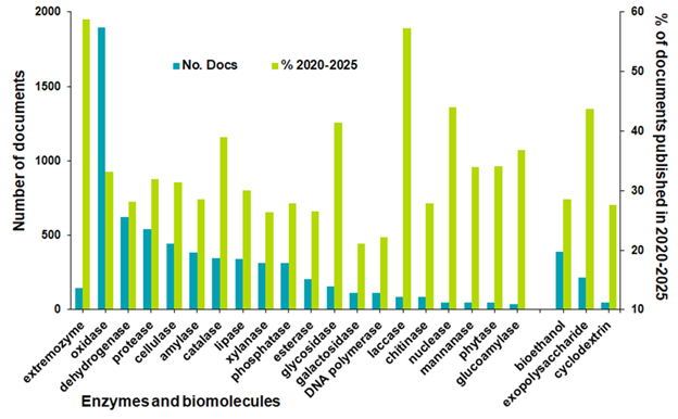 Analisamos a CAS Content Collection para entender melhor as tendências de crescimento em pesquisas especificamente relacionadas a extremozimas e biomoléculas (ver figura 3):