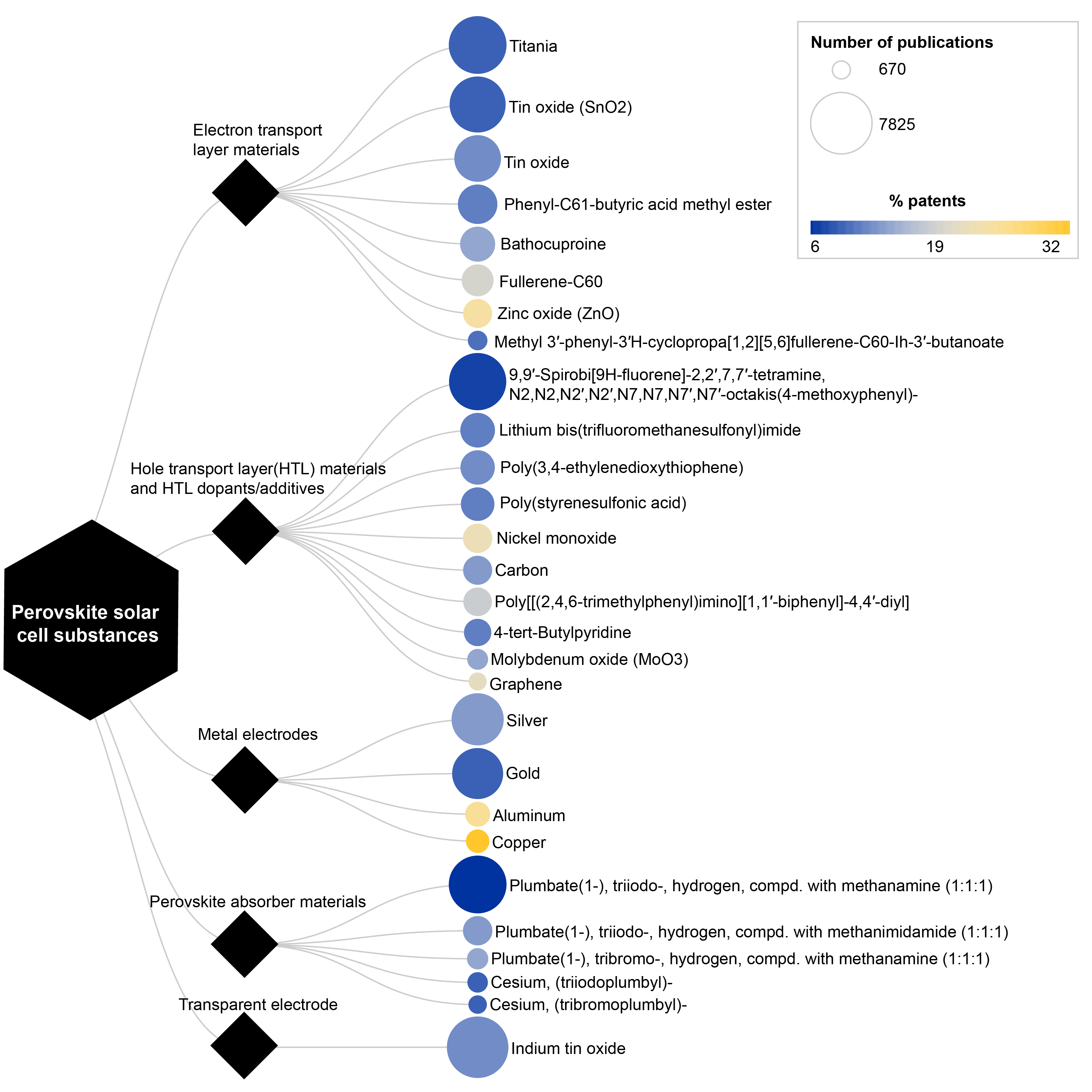 Before we explore research concepts in more detail, let's examine the substances present in the highest number of perovskite solar panel publications. We analyzed the chemical substances reported in these publications using the CAS Registry®, a comprehensive database containing over 279 million registered substances from research literature. What we found revealed distinct patterns in research focus and commercial development trajectories (see Figure 3).