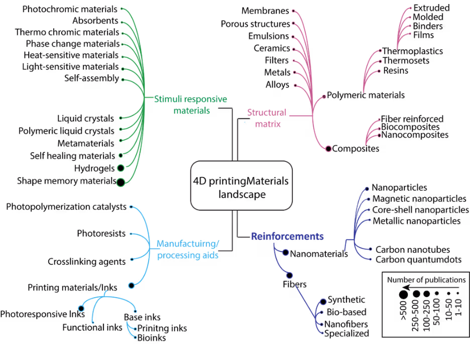 Although 4D printing often builds on established material classes, it is relatively complex due to the need for specialized formulations and multifunctional properties that enable controlled, stimuli-responsive transformations. As a result, the materials landscape encompasses stimuli-responsive materials, those composing the structural matrix, reinforcement materials, and manufacturing/processing aids (see Figure 2).